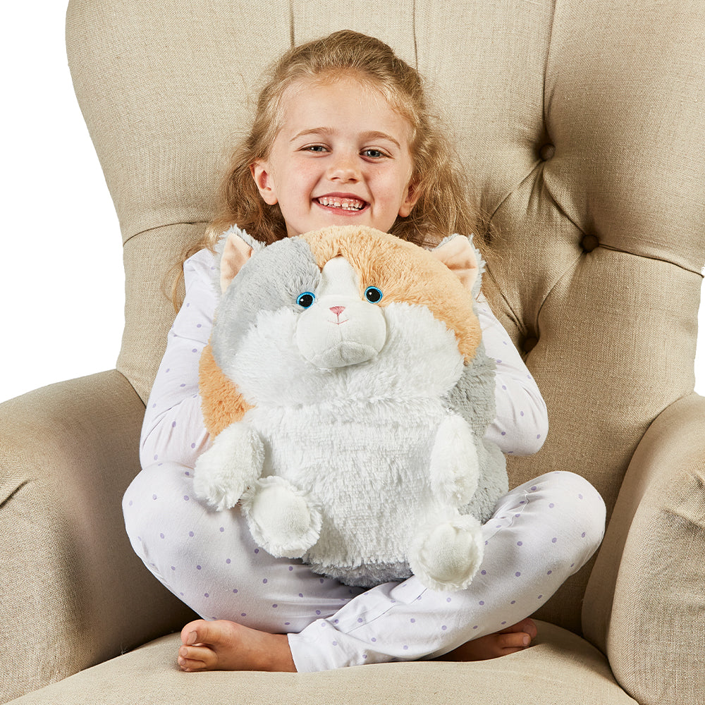 Curl up with the purr-fect comfort companion. Supersized Warmies® are super cuddly, super fun and the biggest Warmies ever. Supersized Cat Warmies features a removable heat pack that offers an extra element of warming or cooling ease. These cuties have many uses – a toasty hand warmer by day, a huggable pillow by night